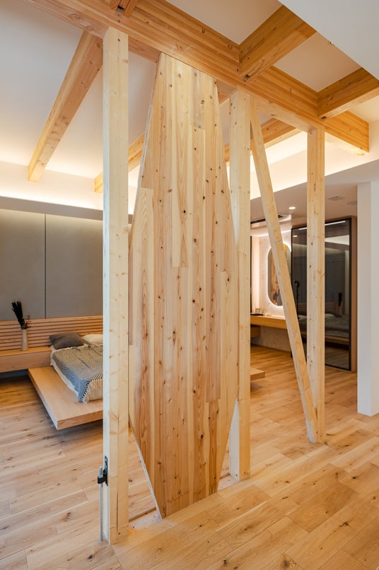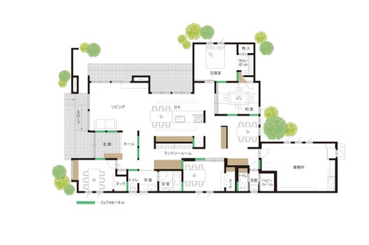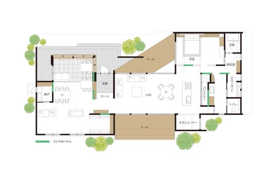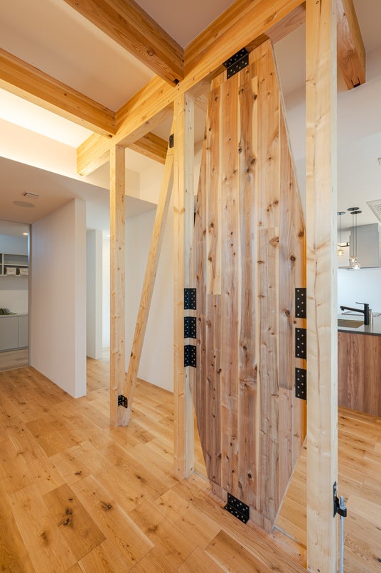 CLTハイブリッド構法とは、日本古来の木造軸組工法における筋交い部分をCLTパネルを用いた耐力壁に置き換えた工法で、当社がオリジナルで開発いたしました。CLTは高強度でありビルや公共施設などの大型建築物に多く使用されている木質建材ですが、住宅に利用するにはオーバースペックでコストメリットが少なかったため、木造住宅に適した大きさや厚みとし、長く住み続けられる木造住宅を実現いたしました。この工法を注文住宅に標準搭載した新商品『CLT MASTERS』はCLTパネル工法の強く開放的な空間を創ることができるというメリットはそのままに、在来軸組工法と癒合させることでコストダウンを図りながらも自由で安心な住まいを提供します。