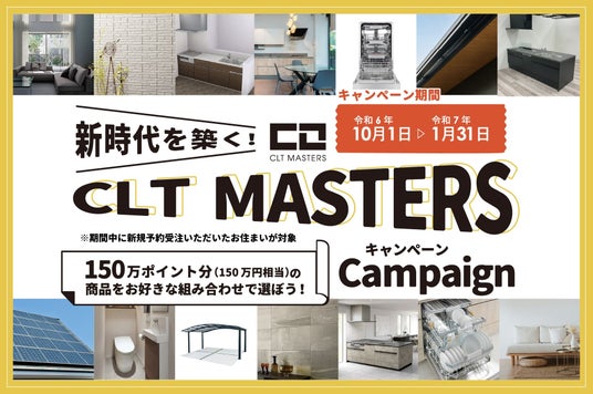 キャンペーン概要/■対象期間:2024年10月1日~2025年1月31日までの期間中に新規予約受注、2025年12月までに着工いただける住まいが対象です。■対象のお客様:CLT MASTERSでご契約のお客様(企画住宅、分譲住宅は対象外)■設備セレクションシートの併用、補填は対象外です。また、予算を別の項目に当てることは不可とします。■ポイント数は税別として換算いたします。■以下に続くマイナスポイントオプションは不可:気密工事/断熱等級6/ダクト式第一種換気取止(ただしダクトレス式第一種換気への変更は可)■ポイントの換金は不可です。ポイントに余りがある場合も減額対応はできかねます。■本キャンペーンチラシ掲載の商品画像はイメージで、実際のものと異なる場合がございます。ご了承ください。