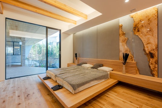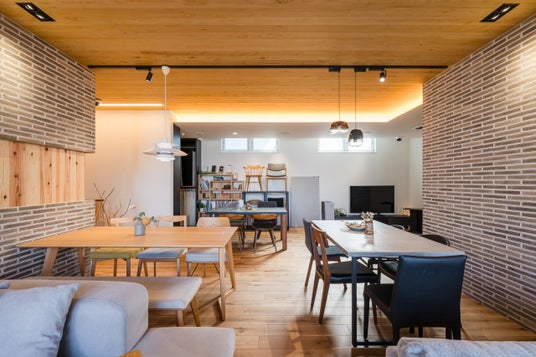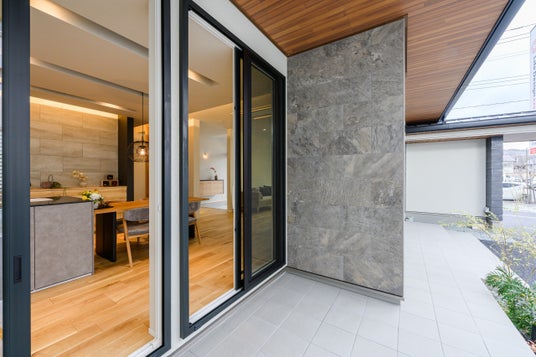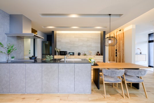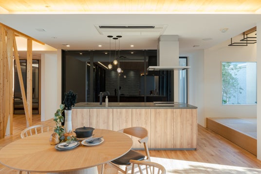 現代のモダンな生活スタイルと、木や石といった日本の伝統的な自然由来の要素を融合。外観デザインはシンプルで洗練されたラインを持ちつつ、木とガラスを多用することで自然との一体感を強調しています。広々としたLDKには自然光をたっぷり取り込む大きな窓と、読書やコーヒータイムを楽しめるヌックを取り入れ、家族全員がリラックスできる明るく開放的な空間といたしました。
