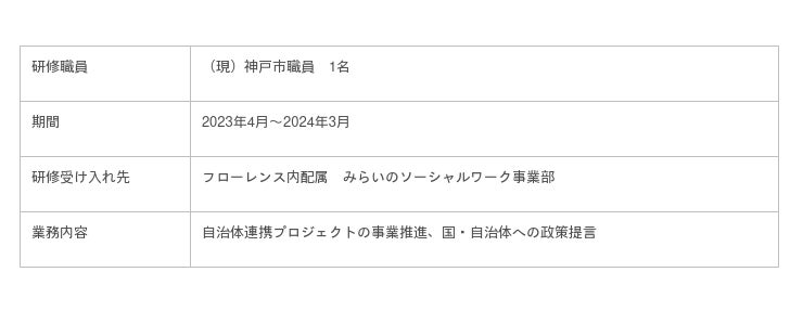 2023年4月より1年間、神戸市職員1名を、フローレンスのみらいのソーシャルワーク事業部にて受け入れます。地方行政での経験を生かし、期間中は主に自治体連携プロジェクトの事業推進や、国・自治体への政策提言についてフローレンススタッフと共に推進します。