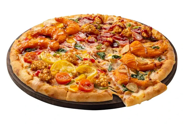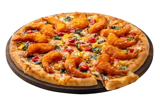 サクサク食感の衣をまとったプリプリの大エビと、ピリッと香るスイートチリソースの旨みがたまらない1枚!香ばしさとサクサク食感を楽しんでいただけるように、特殊製法で殻ごとフリッターに仕立てました。スイートチリソースは、甘みの中に、ライム果汁の爽やかな風味とローストガーリック、唐辛子が感じられるオリジナルレシピで暑い夏にぴったりな1枚です。