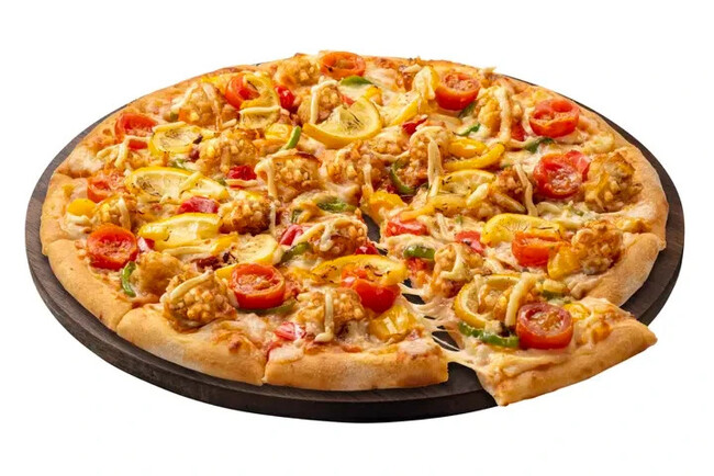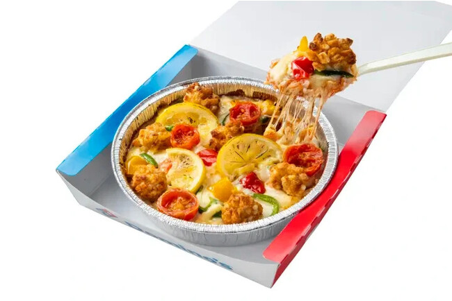 バター風味ライスの上に、たっぷりのサクサクチキン、レモン、トマト、ピーマンをトッピングした彩りも鮮やかな逸品です。スライスしたレモンを一緒に焼き上げて、サッパリときかせた酸味がバターライスとの相性も抜群で、暑い夏にこそ食べたくなる爽やかな風味をお楽しみいただけるピザライスボウルが完成しました。チキンのサクサク食感とチーズの絡んだバターライスとの相性はスプーンがとまらない美味しさです。