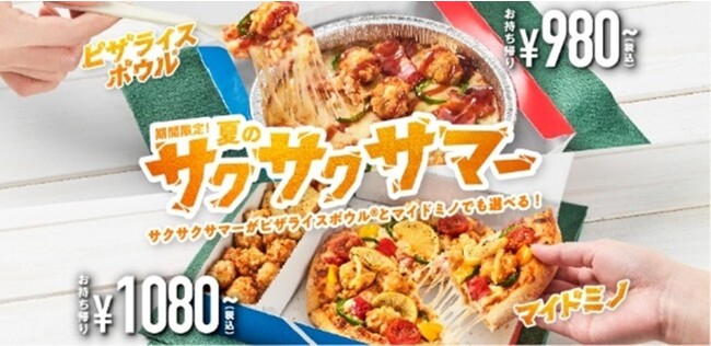 「夏のサクサク・クワトロ」をはじめとする、夏の新商品発売に合わせ、発売4カ月で150万食を売り上げたおひとり様向けセット「マイドミノ」や、ピザとサイドが大きな一つのボックスに詰まった「BIG BOX(ビッグボックス)」、バターライスの上に、モッツァレラチーズとピザのトッピングをのせて焼き上げた「ピザライスボウル(R)」に、夏の新メニューが期間限定で仲間入りします。