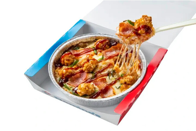 バター風味ライスの上にクルトンやライスパフを使用したサクサクチキンをふんだんに使用した、チキンのサクサクの食感とBBQソースとの味わいをお楽しみいただける、期間限定のピザライスボウルです。チキンのサクサク食感とチーズの絡んだバター風味ライスの相性はやみつきになる美味しさです。今回ピザライスボウルに初めてBBQソースを合わせました。