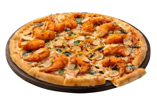 サクサク食感の衣をまとったプリプリの大エビと、マヨソースを合わせたエビマヨネーズ風味のピザに、ガーリックをきかせた、食欲をそそる1枚!香ばしさとサクサク食感を楽しんでいただけるように、特殊製法で殻ごとフリッターに仕立てました。甘味のあるマイルドなマヨソースとサクサクエビ、ガーリックの組み合わせがたまりません。