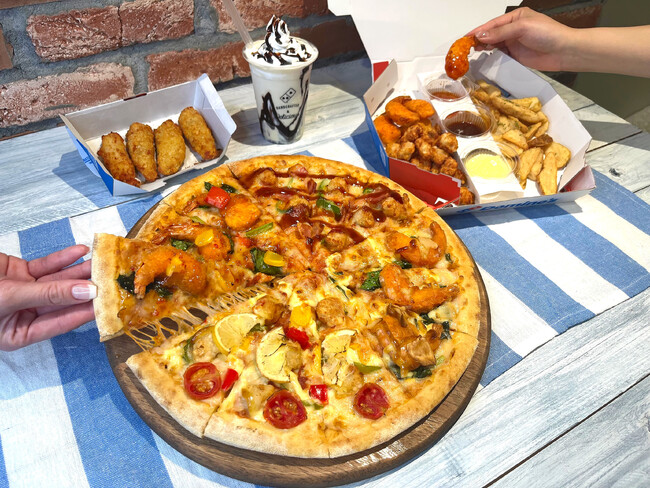 「ビッグボックス」は42センチx43センチの大きなボックスに、Sサイズピザ2枚と、サイドメニュー4品が詰まった見た目にもスペシャルな商品です。今回夏の新商品として、お好きなSサイズピザ2枚と、ポテトフライ、ひとくちサクサクチキン、まるごとサクサクエビとスイートチリソース、ディッピングソース(BBQソース&マヨソース)を大きなボックスに詰め込んだ「BIG BOXサマー(ビッグボックスサマー)」が、期間限定で仲間入りします。子どもたちの夏休みの昼食や家族や仲間と集まるタイミングなど、ピザを囲む人数や様々なシチュエーションに合わせて、夏の新メニューをとことんお楽しみください。