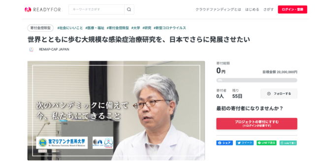 ・概要 :REMAP-CAP(A Randomized, Embedded, Multifactorial, Adaptive Platform trial for Community-Acquired Pneumonia)とは、世界中の医療者と協力し、重症市中肺炎の最適な治療法を早期に見出すことを目的とした大規模国際プラットフォームでCOVID-19を含む呼吸器感染症・重症市中肺炎の研究に関わっています。新型コロナウイルス感染症に限らず、今後起こりうる感染症・パンデミックにいち早く対応していくため未知な治療法を効率的に研究する体制を構築するためにクラウドファンディングプロジェクトに挑戦します。