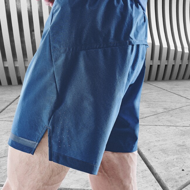 軽いランニングやウォームアップに適したストレッチ素材のジャケットとテクニカルなランニングショーツ。ジャケットの左右のポケットは内側がメッシュ生地になっているため、ファスナーを開けるとベンチレーションにもなります。パンツのウエスト後ろ側にはメッシュゴムを配置し、腰周りの汗冷えを軽減。切り替えベンチレーションを配置し、スマホなどを収納できるポケットも搭載。足上げ時の生地のつっぱり感を軽減するスリットや、縫い代を表に出すことで肌面をフラットにし連続する足上げによる摩擦を軽減し、着用快適性を実現しています。