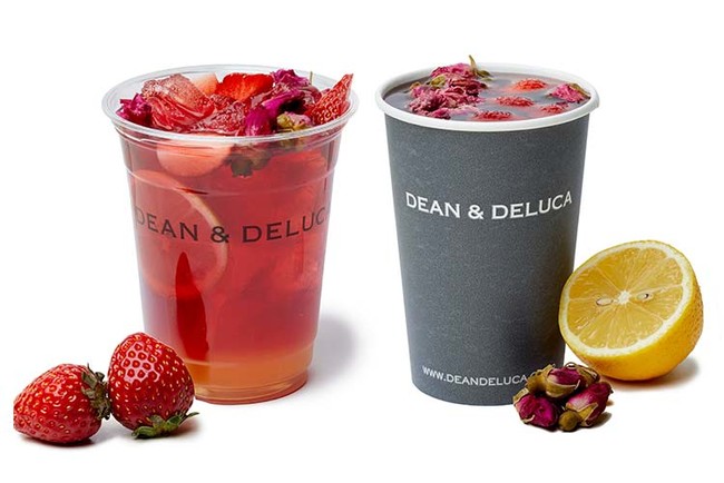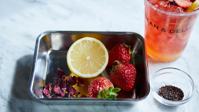 4月のシーズナルドリンクは、フルーツとお花を掛け合わせてつくった彩りも鮮やかな紅茶が登場。ふわりと香るローズにフレッシュのいちごを加えた「ティーレモネード」と、爽やかなシトラスに、たっぷりのパイナップルを加えた「フルーツティー」。花咲く季節に似合う、春の味わいに仕上げました。