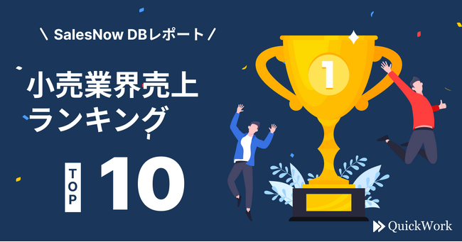 「データとテクノロジーで、働き方を変革する。」をミッションに掲げ、日本全国500万社以上の企業データを基盤に営業の効率化を支援する「SalesNo禍w」を展開してきた株式会社QuickWork(本社:東京都渋谷区、代表取締役:村岡功規、以下「QuickWork」)は、日本全国500万社以上の企業情報を網羅した日本最大級のデータベースを誇る「SalesNow DB」において、小売業界の売上ランキングTOP10を抽出したのでお知らせします。
