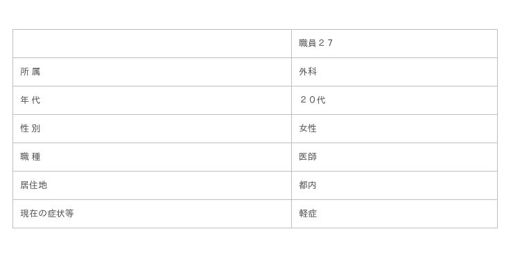 ・発熱症状のあった医師(職員27)について、PCR検査の結果、陽性が判明した。