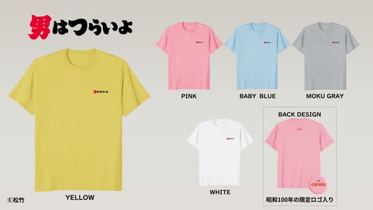 胸元に「男はつらいよ」ロゴをシンプルに配置、背面には松竹ロゴと、昭和100年ロゴをプリントしております。