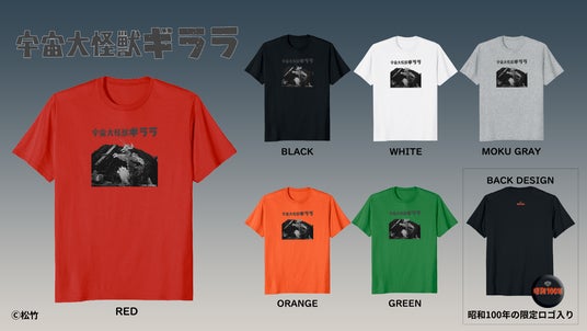 前面は大暴れするモノクロのギララを配置、背面には松竹ロゴと、昭和100年ロゴをプリントしております。