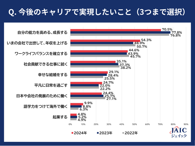 「今後のキャリアで実現したいことを3つ選択してください」と質問したところ、「自分の能力を高める、成長する」が70.5%、「いまの会社で出世して、年収を上げる」が54.3%、「ワークライフバランスを確立する」が44.6%、「社会貢献できる仕事に就く」が35.1%、「幸せな結婚をする」が29.1%、「平凡に日常を過ごす」が24.7%、「日本や会社の発展のために働く」が24.4%、「語学力をつけて海外で働く」が9.9%、「起業する」が4.8%となりました。