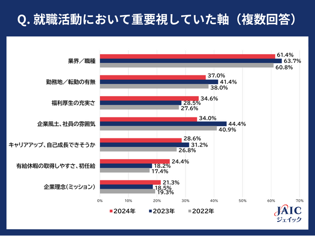 また2022年・2023年の調査結果と比べると、「福利厚生の充実さ」「有給休暇の取得しやすさ、初任給」「企業理念(ミッション)」が増加傾向となり、2年前の2022年調査結果からは、「福利厚生の充実さ」と「有給休暇の取得しやすさ、初任給」が7.0ポイント、「企業理念(ミッション)」が2.0ポイント増加しています。