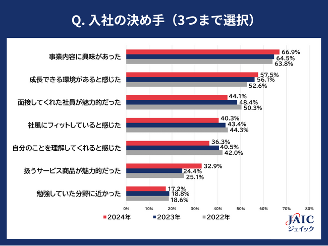 また2022年・2023年の調査結果と比較すると、「事業内容に興味があった」「成長できる環境があると感じた」「扱うサービスや商品が魅力的だった」が増加傾向となり、2年前の2022年調査結果と比べると、「扱うサービスや商品が魅力的だった」が7.8ポイント、「成長できる環境があると感じた」が4.9ポイント、「事業内容に興味があった」が3.1ポイント増加しています。