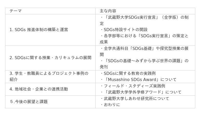 本白書では、学内外の関係者との協働を通じて実施されたプロジェクトを包括的に紹介し、持続可能な社会の実現に向けた大学の歩みと成果をわかりやすく可視化しています。全80ページにわたり、本学におけるSDGsへの取り組みを、教育・研究・社会貢献の観点から整理したもので、主に以下5つのテーマで構成されています。