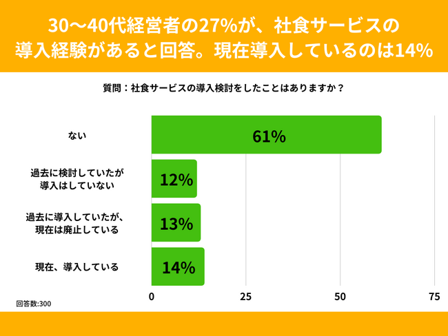 30~40代男女を対象とした「社食サービスの導入検討をしたことはありますか?」というアンケートで最も多かった回答は「ない」で61%でした。