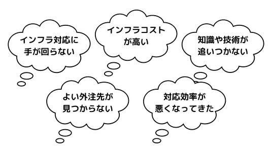 - クラウドエンジニアの不足問題エンジニア不足により、技術的負債の解消が後回しにされ、経営リスクの増大や、DX推進などのコア業務に集中できないといった課題が生じます。こうした課題を抱える企業に対して、「Mx.インフラソリューション」は、業務の一部を委託または請負う形で支援いたします。特定のニーズに応じて高度な専門知識を持つエンジニアを柔軟にアサインし、迅速かつ効率的にプロジェクトの遂行をサポートします。