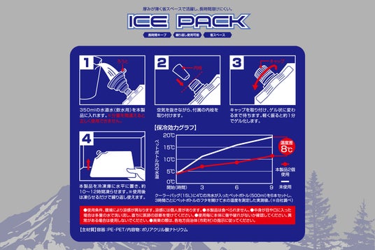 特徴:水を入れて凍らせるだけ!「再利用できるソフトタイプの保冷剤」ソフトタイプなので冷凍庫に収まりやすく、クーラ-バック内のすき間に入れ込みやすいのが嬉しいポイント。使用時の厚みは約2cmで省スペースに収まり、クーラ-バック内のすき間に入れ込みやすい!運動会やキャンプ、釣りなどのアウトドア時に大活躍すること間違いなし。
