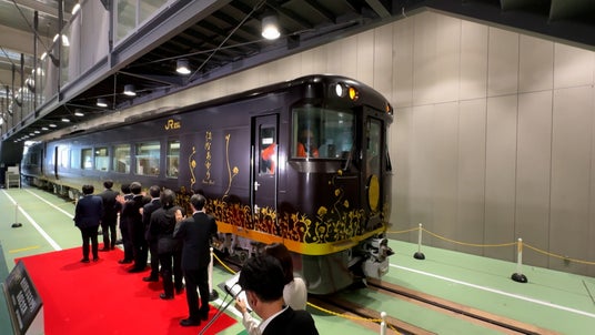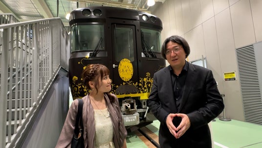 京都駅近くにある日本最大規模の鉄道博物館に現れたのは、早朝からハイテンションの久野。運行開始前のはなあかりを間近で見られるとあって、早くも浮足立っているようだ。列車は施設内に乗り入れてくる形でお目見え。ボルテージが高まる登場シーンに、礼二も「鉄道博物館に入ってくるお披露目って珍しい」と驚く。