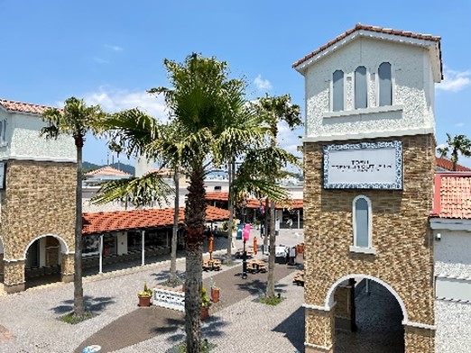 明るい陽光が似合うカリフォルニア南部の街をイメージ、そびえ立つパームツリーに白壁や暖色系の屋根瓦、タイル模様が美しい九州最大級のアウトレットセンター。