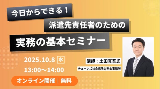 総合人材サービスのマンパワーグループ株式会社(本社・東京都港区、代表取締役社長:池田 匡弥、以下マンパワーグループ)は、10月8日(水)13:00~14:00に、派遣社員を受け入れている企業の責任者・人事担当者を対象とした無料オンラインセミナー「派遣先責任者のための実務の基本」を開催します。本セミナーでは、派遣先責任者が直面しやすい実務課題に焦点を当て、行政調査への対応や日常業務での具体的な対処法を解説します。
