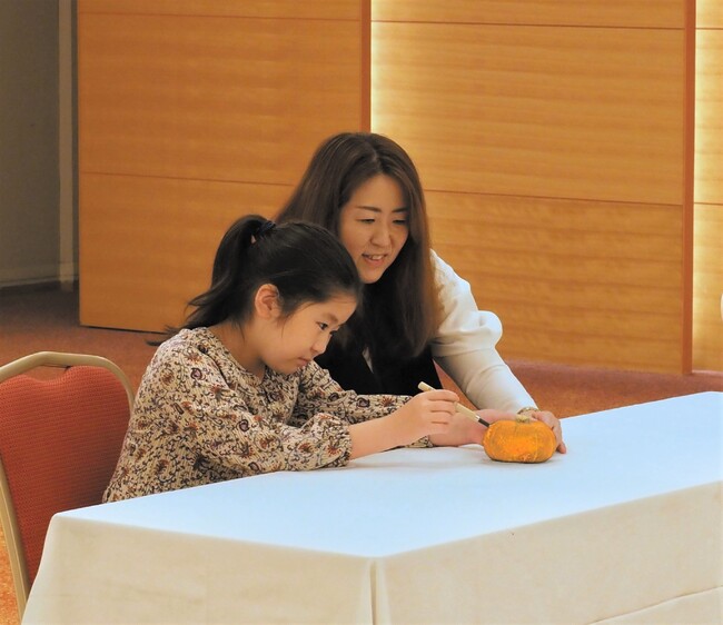 ハロウィーンシーズンを親子で楽しんでいただきたいと考え、小学生以上の方を対象に、数々の大会で優勝経験をもつホテルの氷彫刻師 小阪芳史指導のもと、こどもでも彫れる柔らかいペポカボチャで彫刻刀を使用しながらジャック・オ・ランタンづくりが体験できるワークショップをご用意いたしました。