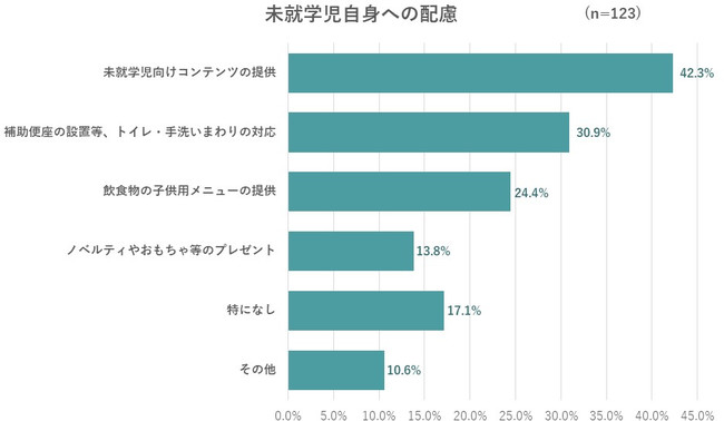 未就学児自身への配慮としておこなっているのは「未就学児向けコンテンツの提供」が42.3%、「補助便座の設置等、トイレ・手洗いまわりの対応」が30.9%、「飲食物の子ども用メニューの提供」が24.4%