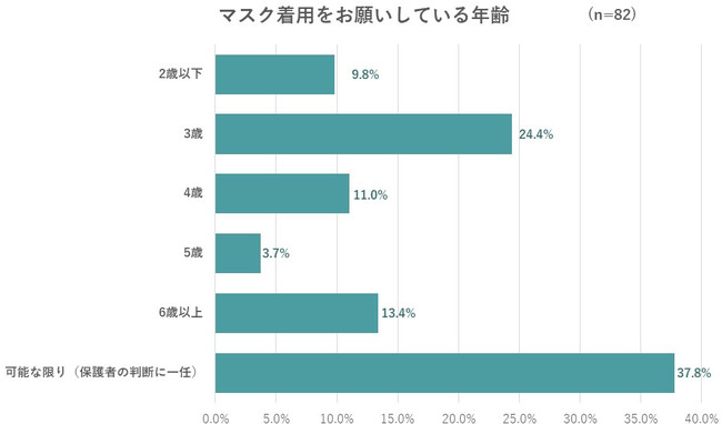 マスクの着用は「可能な限りでお願いしている(保護者の判断に任せる)」が37.8%で最多。年齢での区切りを設けている場合の最多は「3歳」