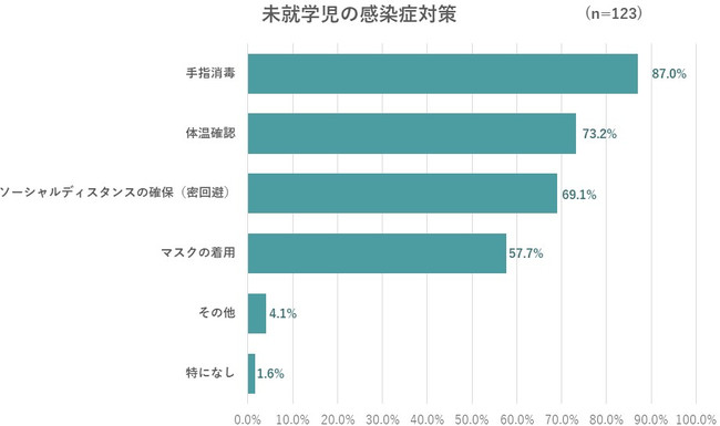 未就学児にお願いしている感染対策は「手指消毒」が87%、「体温確認」が73%、「ソーシャルディスタンスの確保」が69%、「マスクの着用」が57.7%