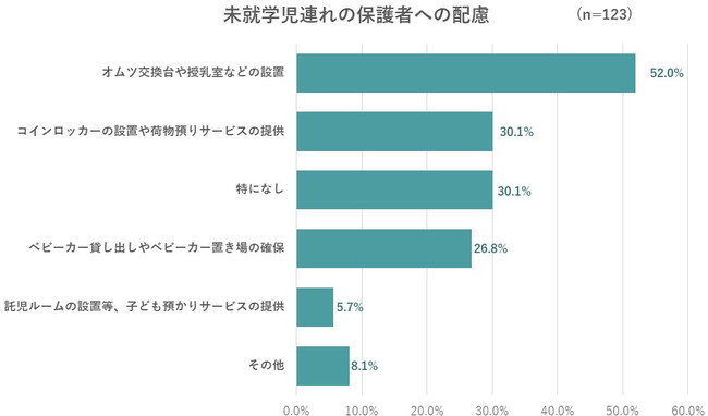 未就学児をもつ親に向けての配慮としておこなっているのは「オムツ交換台や授乳室などの設置」が52%、「コインロッカーの設置や荷物預かりサービスの提供」が30.1%、「ベビーカーの貸し出しやベビーカー置き場の確保」が26.8%