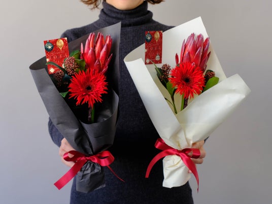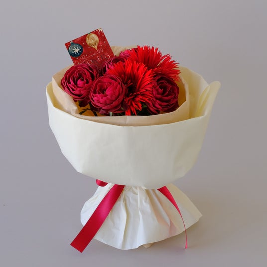 ショップおすすめの赤い花をシンプルなブーケに仕上げました。コンパクトなサイズでちょっとしたギフトやご自宅用にもおすすめです。