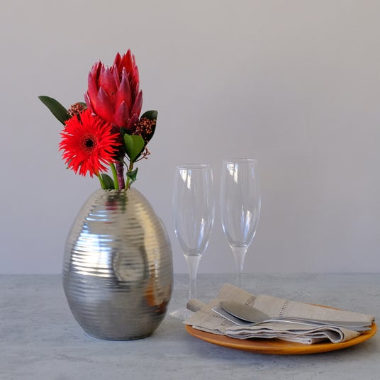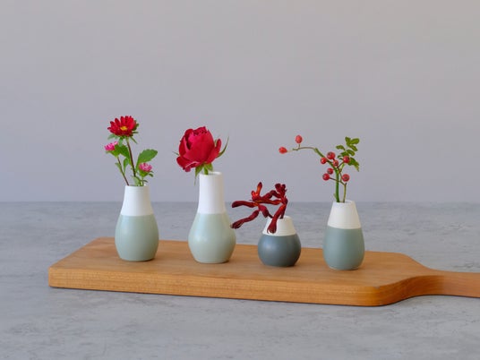 小さな蓋付きの容器を花器に。洗面所などにさりげなく置いても赤い花が存在感を放ちます。