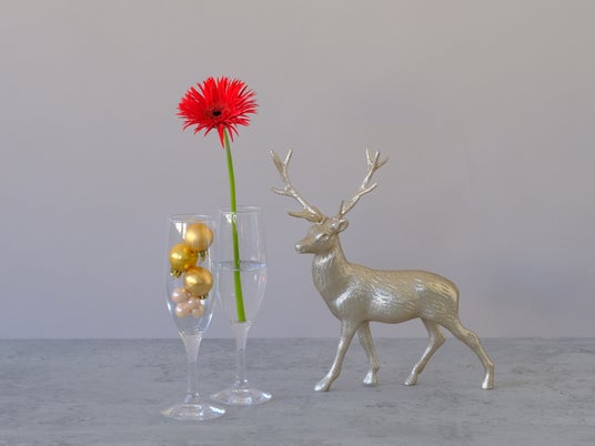 ガーベラをシャンパングラスに。もう一つのグラスにはクリスマスオーナメントを入れてみました。