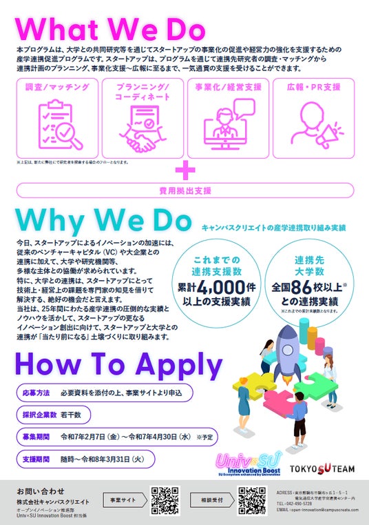株式会社キャンパスクリエイトは、令和6年度 東京都「多様な主体によるスタートアップ支援展開事業」(TOKYO SUTEAM)に採択され、スタートアップと大学の産学連携を促進し、モデルケースの構築と普及啓発に取り組んでいます。