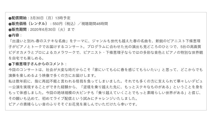 『ピアニスト下條恵理子コンサート 春の名曲セレクション2020~出逢いと別れ~』