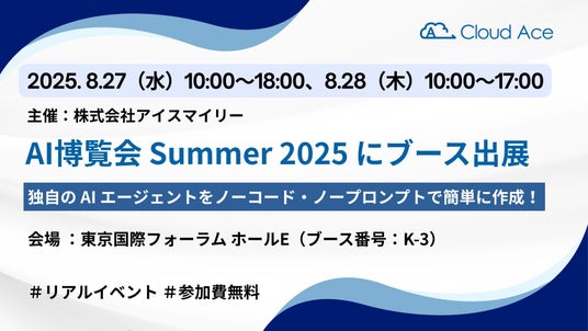 クラウドエース株式会社(本社:東京都千代田区、代表取締役社長:青木 誠/以下「クラウドエース」)は、8 月 27 日(水)・ 28 日(木)に開催される AI博覧会 Summer 2025 にブース出展することをお知らせいたします。