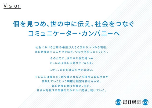 毎日新聞社の丸山昌宏社長は「コミュニケーター・カンパニーは聞き慣れない言葉ですが、社員や会社が起点となり、双方向のコミュニケーションを生み出し、広げることで、多くの人を支える存在になる。人と人とをつなぎ、社会のあり方や人々のくらしを前向きに変えていく存在を目指していきます」と話しています。
