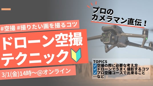 1/25(木)に開催し、大好評だった「プロのカメラマン直伝!空撮テクニック」セミナーを今週の金曜日、3/8(金)に再度開催いたします。今回はカメラマンとしても活躍してきた、そらメディアの代表が皆様に空撮テクニックを伝授!新しい講習コース「空撮プロコース」の内容も踏まえお話ししてまいります。