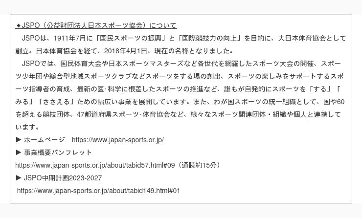 スポーツを「する」「みる」「ささえる」ための環境づくりを行うJSPO(正式名称:公益財団法人日本スポーツ協会 東京都新宿区/会長 遠藤利明)は、標記大会について、下記の通り内容を変更し開催いたします。