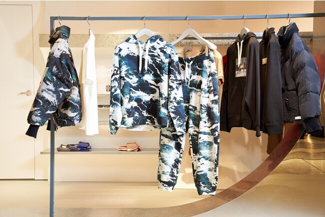 本ポップアップでは、伊勢丹先行発売アイテムも登場しています。氷河のイメージや氷が全面に施されたダウンジャケットやスエットのセットアップ。