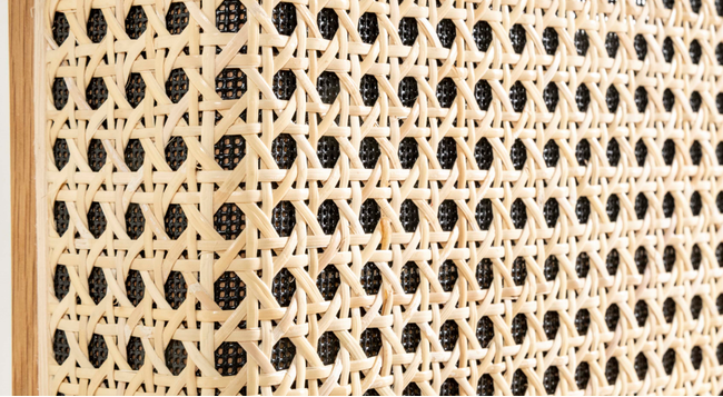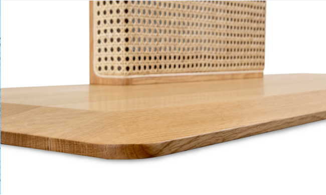 スタンドの全面にラタン(籐)を使用することにより、室内を明るく感じていただけます。秋田木工では多くの椅子制作においてラタンを使用していることから、ラタンを張る高い技術を有しています。職人が一品一品手作業で行なうラタン張りの技術もこの製品の魅力です。また、全面のパーツには当初、そのままラタンを張り付けていたのですが、配線などが透けて見えることから黒のメッシュ状生地を下張りすることにより、ラタンの美しさをそのまま生かすことができました。
