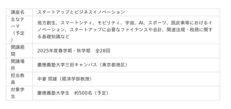 KPMGコンサルティング株式会社(本社:東京都千代田区、代表取締役:関 穣、田口 篤、知野 雅彦、以下、KPMGコンサルティング)と慶應義塾大学(所在地:東京都港区、塾長:伊藤 公平)は、最新のテクノロジーの動向からアカウンティングやファイナンス、関連法規など、“起業”に必要な知識を体系的に学ぶ寄附講座「スタートアップとビジネスイノベーション」を、同大学三田キャンパス(所在地:東京都港区)において、2025年4月11日(金)から開講します。本寄附講座は4年連続の開講となります。