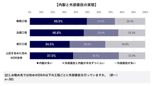 - 実行工程においては「内製が多い(34.5%)」、「外部委託が多い(34.6%)」がほぼ同数で、他工程よりも外部委託割合が高くなっている。