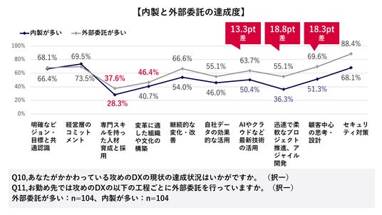 - 内製が多い層は、外部委託が多い層より達成度が低い。特に「専門スキルを持った人材育成と採用(28.3%)」の達成度が低い。