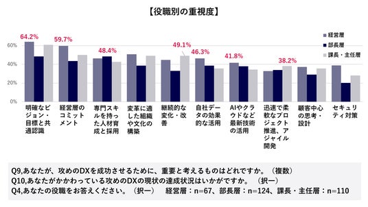 - 経営層は「明確なビジョン・目標と共通認識(64.2%)」、「経営層のコミットメント(59.7%)」の重視度が高く、「自社データの効果的な活用(46.3%)」や「AIやクラウドなど最新技術の活用(41.8%)」といった技術的な面も他役職層に比べて高い。