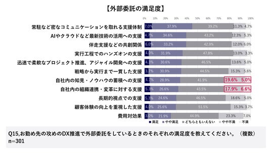 - 費用対効果以外で不満度が高い項目は、「自社内の知見・ノウハウの蓄積への支援(24.6%)」、「自社内の組織連携・変革に対する支援(24.5%)」。内製体制への貢献も求められていることがうかがえる。