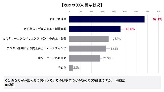 - 「プロセス改善(67.4%)」、「ビジネスモデルの変革・新規事業(45.8%)」に関与している人が多い。