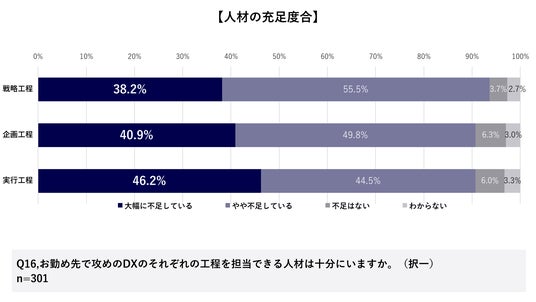 2.90%超の企業で戦略・企画・実行工程の全てにおいてDX人材が不足。特に実行工程は「大幅に不足」が46.2%と他工程より深刻